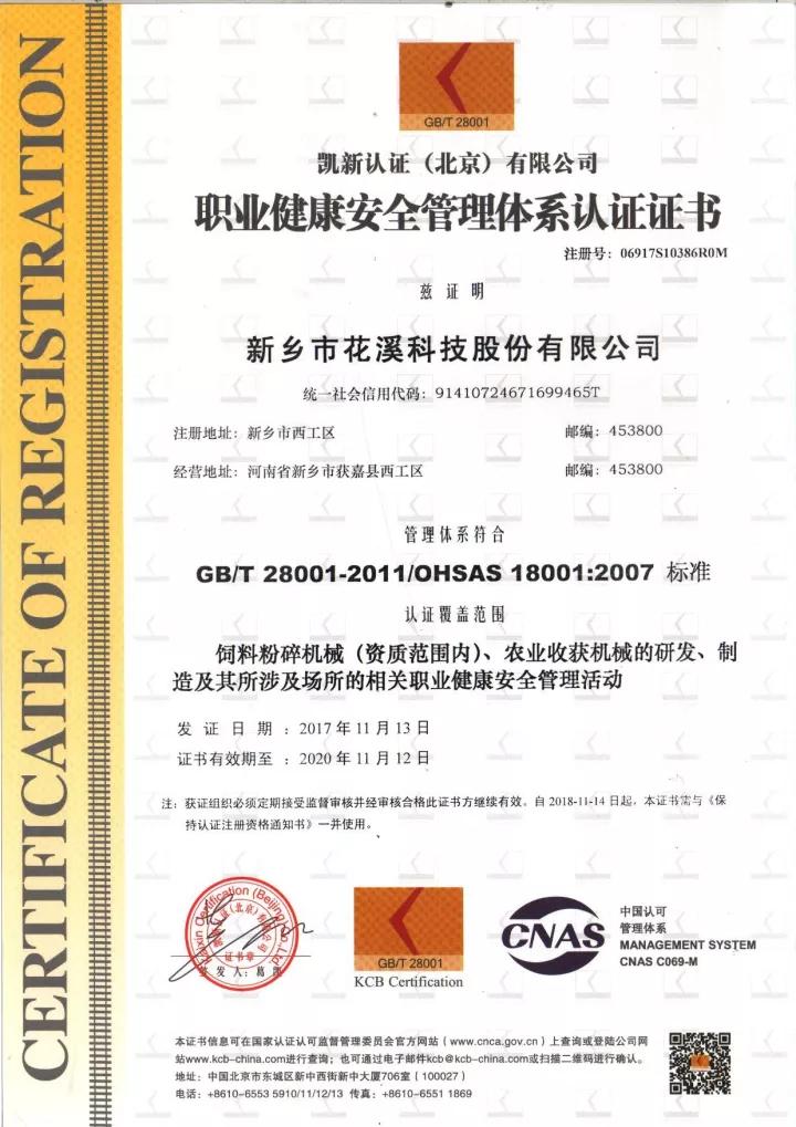2017年11月13日,花溪公司獲得了環境管理體系(ISO14001)認證證書和職業健康安全管理體系(OHSAS18001)認證證書。